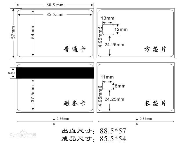 PVC塑料卡常识 | 以PVC材料制作的卡叫做PVC卡。即常见的银行卡用料。 PVC卡的印刷效果可具有色彩鲜艳、多样性等特点。PVC是聚氯乙烯材料的简称,英文学名PolyVinyl Chloride,是以聚氯乙烯树脂为主要原料,加入适量的抗老化剂、改性剂等,经混炼、压延、真空吸塑等工艺而成的材料。PVC料有分灰料(回收料)、中料(夹中料)、白料、全新料,一些厂家为了压价钱通常采用的是回收料来降低成本。我们主要采用好料做好卡。 ①尺寸:标准尺寸为85.5mm×54mm,设计88.5mm×57mm(含出血位)。 非标卡需另外开模具,工期较长而且需另外加模具费,非标卡不能打平码、凸码、条码、只能喷码及喷条码。 磁条高12.7mm,离边4.7mm 设计时,一般用coreldraw排版,最终文件转曲后格式一般存为Corldraw9.0。 ②厚度:标准厚度为0.76mm,也可做0.2mm、0.38mm、0.84mm、1.0mm,但需另外收费。 ③印刷:分胶印、丝印、丝印加胶印。胶印就是四色,有渐变色。丝印就是丝网印纯色,无渐变色。 ④卡号:可分打平码、喷码、激光码、凸码(小凸码、大凸码) 凸码可以烫金、烫银、烫黑金,请在下单时加以说明; 凸码不可以坚排(即凸码不能与卡的短边平行,只能与长边平行), 非标卡不能打凸码,哑面卡、磨砂卡不能打平码。 凸码有小凸和大凸之分,小凸码为14号字,大凸码为18号字; 凸码位不宜过长(19位以下均可打),14位以下为宜,过长的凸码可能会把卡打弯; 凸码距边(不含出血位)至少4mm-5mm,否则有可能出现凸码打坏卡的现象。 喷条码一般是code128码、code39码、EAN-13码和二维码,通常使用比较多的是128和13码 ⑤颜色:每次印刷有一定的色差,一般为10%左右,如果有样卡,会以样卡为主,印刷时尽量接近样卡的颜色,但也不可能达到100%。如果需要丝印金底和银底的需特别注明(即是闪底)。 ⑦刷卡方式:按刷卡方式常分为带磁条卡、条码卡、芯片卡 带芯片的叫做芯片卡/智能卡(如IC卡、ID卡),IC卡(ID)卡必须说明用什么样的芯片(芯片型号),常用芯片为国产M1芯片(与上海复旦F08及进口原装芯片-菲利浦S50通用) ⑧表面效果工艺:亮面、哑面及磨砂等效果是在合成时用钢版压出来的 这点与纸品不同,纸卡的表面亮面及哑面效果是直接过光胶或哑胶而成的。 ⑨后加工艺:UV、签名条、烫金、打码、写磁 包装:有凸码的或芯片卡、加厚卡一般为200张/盒;无凸码的非芯片卡一般是250张/盒 重量:1000张标准卡约为6公斤左右