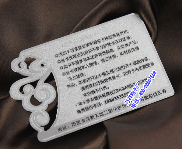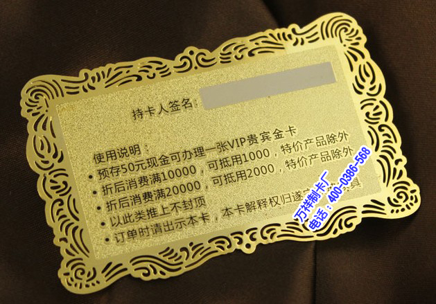 仿金卡:卡色偏显暗淡,时间稍一长卡片表面容易出现褪色、泛痕等现象。真金卡也只是当时卡色金黄,时间一久也失去真金色泽。电泳金卡:采用最新技术制作,色泽有如真金般光泽,具有独特的浮雕立体感,质感倍增,更显金属贵宾卡的尊贵档次。并且能保持产品永不褪色的特点。原理类似在金属卡表面镀了一层抗氧化膜以起到抗氧化的作用。