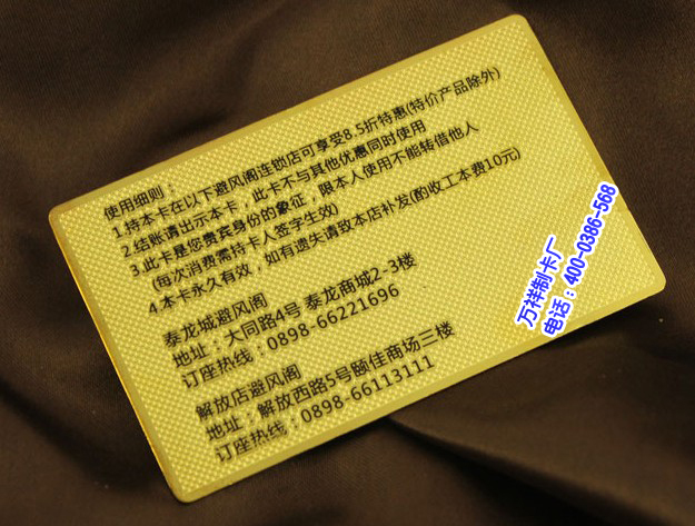 仿金卡:卡色偏显暗淡,时间稍一长卡片表面容易出现褪色、泛痕等现象。真金卡也只是当时卡色金黄,时间一久也失去真金色泽。电泳金卡:采用最新技术制作,色泽有如真金般光泽,具有独特的浮雕立体感,质感倍增,更显金属贵宾卡的尊贵档次。并且能保持产品永不褪色的特点。原理类似在金属卡表面镀了一层抗氧化膜以起到抗氧化的作用。